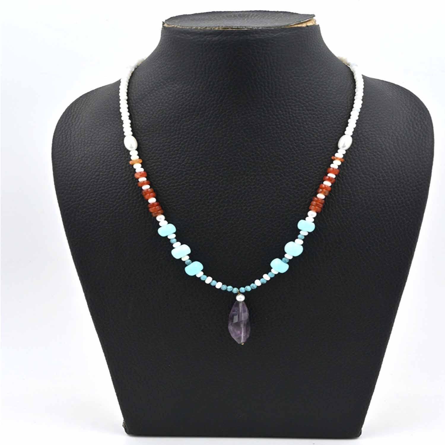 Elegant White Opal Beads Necklace with Turquoise Round Bead Sunstone Rondelle Beads Necklace Blue Opal Beaded Necklace with Amethyst Pendant